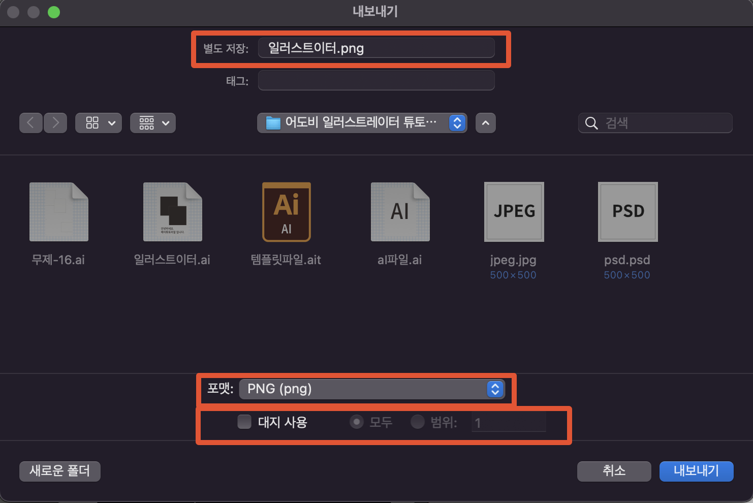 - 체크 o : 대지 사용을 체크하면 모두 또는 범위를 선택할 수 있는데 모두는 아트보드 전체를, 범위는 원하는 아트 보드만 지정할 수 있습니다.