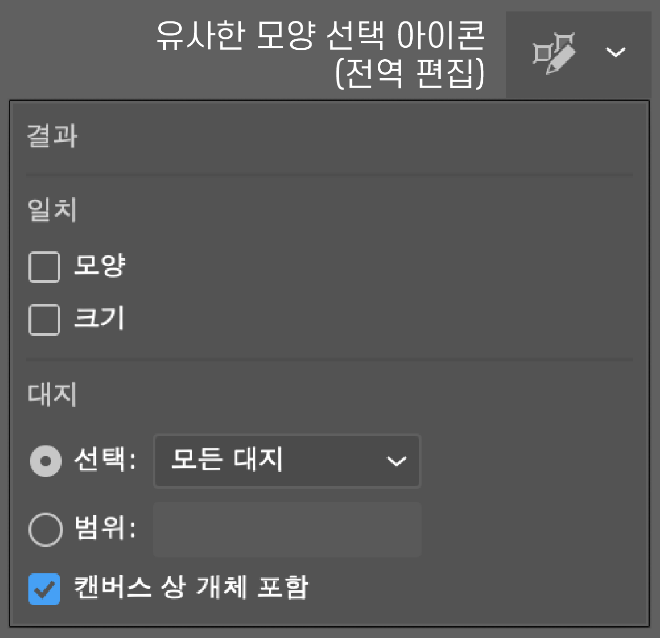 - 캔버스 상 개체 포함 : 체크하게 되면 대지 안에 없는 오브젝트들도 같이 선택됩니다. 기본값으로 체크되어 있습니다.