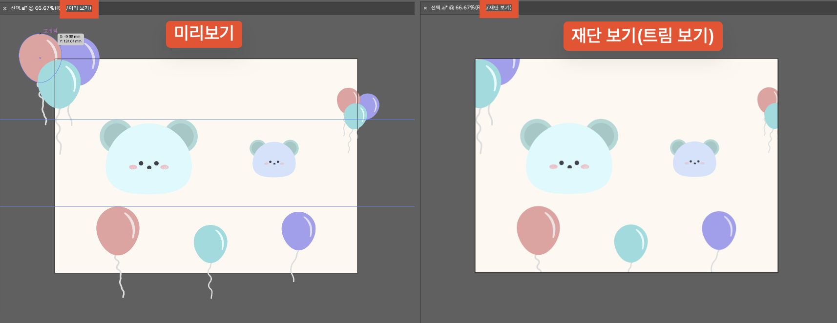 대지(아트보드) 이상으로 넘쳐진 오브젝트를 숨겨줍니다. 그리드, 안내선 등 인쇄되지 않는 것은 안 보이게 되고, 오로지 대지(아트보드) 안에 있는 오브젝트만 보이게 됩니다. 상단 메뉴 보기 > 트림 보기 를 눌러서 전환할 수 있습니다.