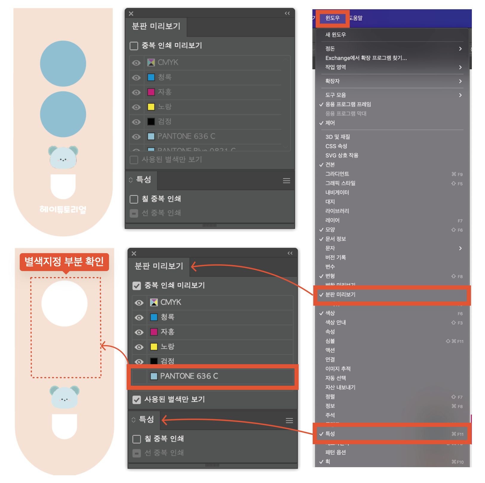 중복 인쇄 미리 보기는 상단 메뉴 보기 > 중복 인쇄 미리보기 또는 단축키(윈도우ctrl + alt + shift + Y / 맥 ⌘(command) + ⌥(option) + ⇧(shift) + Y )를 눌러 전환하거나, 분판 미리 보기 패널에서 중복 인쇄 미리보기를 체크하여 확인할 수 있습니다. 분판 미리보기 패널은 상단 메뉴 윈도우 > 분판 미리보기로 열 수 있습니다. 분판 미리보기는 작업한 문서에 별색을 사용했을 때 제대로 적용이 되었는지 확인을 하거나 인쇄 시 문제점이 없는지 확인할 때 사용합니다. 중복 인쇄 미리보기를 활성화해야 분판을 확인할 수 있습니다.
