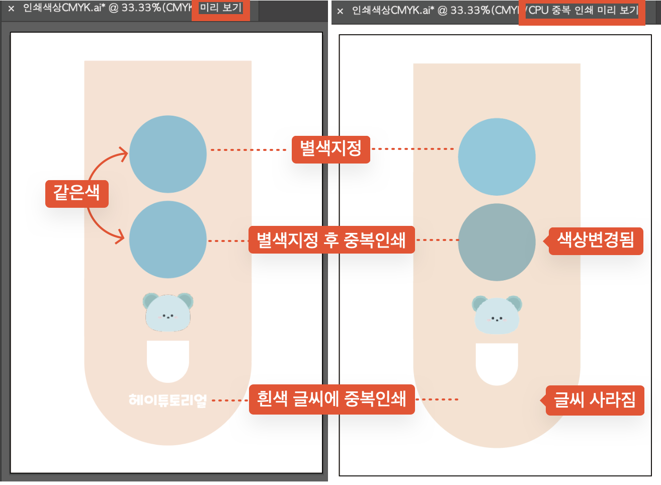 중복 인쇄 설정의 경우 보통 검은색처럼 진한 색상이 연한 색상 위에 있다면 중복 인쇄해도 색상이 변하지 않기 때문에 인쇄를 깔끔하게 하기 위해서 칠 중복 인쇄 또는 선 중복 인쇄를 합니다. 또는 별색을 사용할 때 CMYK판과의 간격이 생길 수 있어 간격을 좁히기 위해 인쇄소에서 자체적으로 겹치는 영역을 만들기 위해서 사용하기도 합니다. 이 부분은 인쇄소마다 다를 수 있어서 참고사항으로만 알아두시기 바랍니다.