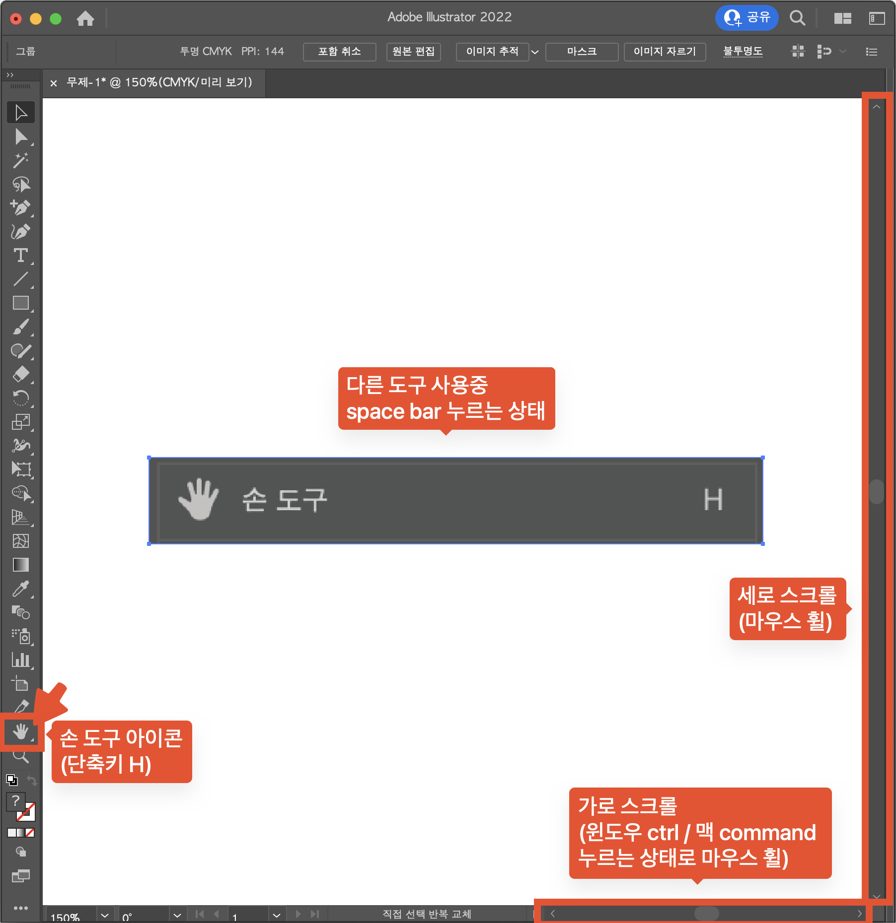 손 도구 아이콘 또는 단축키 H, space bar를 누르는 상태로 선택할 수 있습니다. 클릭 드래그로 문서 화면을 자유자재로 움직일 수 있으며, 문서 화면을 이동하는 것은 자주 사용하기 때문에 다른 도구를 사용하는 중에도 space bar를 계속 누르면 손 도구로 전환하는 단축키를 자주 사용합니다. (텍스트 작성 중에는 손 도구로 변하지 않습니다.)