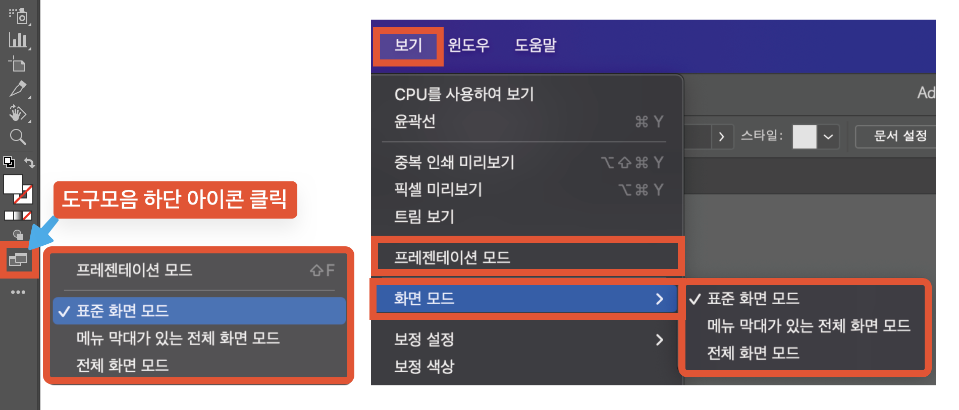 화면 모드는 표준 화면 모드, 메뉴 막대가 있는 전체 화면 모드, 전체 화면 모드, 프레젠테이션 모드로 총 4가지가 있습니다. 화면 모드는 상단 메뉴 보기 > 화면 모드(단축키 F) 또는 프레젠테이션 모드(단축키 윈도우 shift + F / 맥⇧(shift) + F) , 도구 모음 하단 아이콘(창이 두 개 붙어있는 모양)으로 변경할 수 있습니다. 단축키를 사용하면 표준 화면 모드→메뉴 막대가 있는 전체 화면 모드→전체 화면 모드→표준 화면 모드 순서로 화면 모드가 순환되며 변경됩니다.