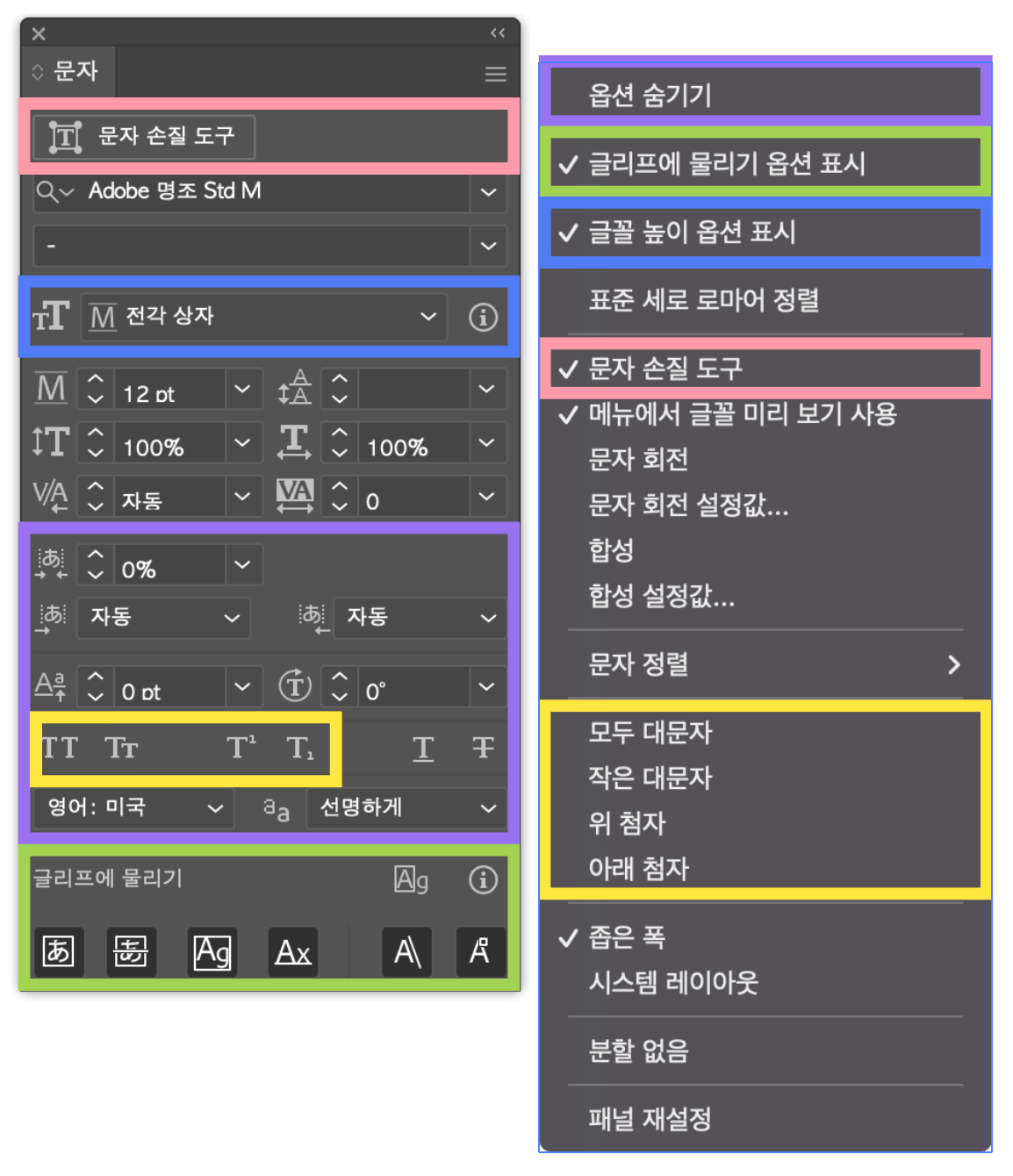 문자 패널에는 아시아 문자에 사용되는 다양한 옵션과 글꼴 높이 옵션, 글리프에 물리기 등 여러 가지 옵션이 있습니다. 문자 패널의 햄버거 버튼을 눌러 다양한 옵션을 체크합니다.