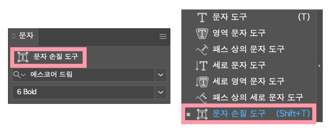 문자 손질 도구를 사용하면 문자를 따로 쓰지 않아도 문자를 각각 수정할 수 있습니다. 문자 패널에서 문자 손질 도구를 클릭하여 사용하거나 도구 패널에서 문자 도구를 왼쪽 버튼으로 길게 누르거나 오른쪽 버튼을 클릭하여 문자 손질 도구를 선택합니다. 단축키 윈도우 shift + T / 맥 ⇧(shift) + T로도 선택이 가능합니다.