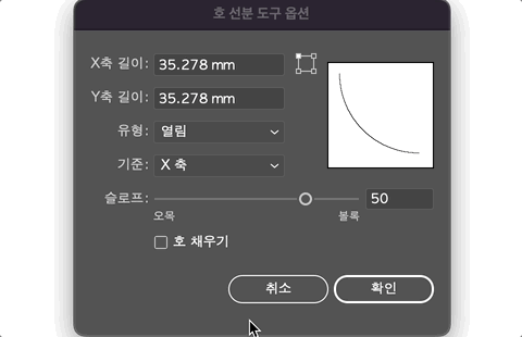 호 도구를 사용 전 경사(슬로프)의 값을 수정할 수 있습니다. 호 도구를 두 번 클릭 또는 또는 윈도우enter / 맥 return으로 옵션 창을 불러올 수 있습니다. 호 선분 도구 옵션의 기본 설정은 유형 : 열림, 기준 : x 축, 슬로프 : 볼록 50, 호 채우기 비활성화로 되어있습니다.