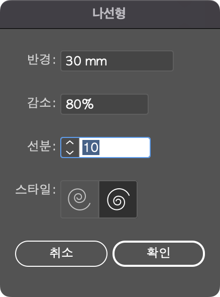 도구 선택 후 클릭 드래그하면 회오리 모양의 패스가 보이고 윈도우 ctrl / 맥 ⌘(command)을 계속 누르는 상태로 드래그하면 나선형 옵션의 감소를 변경합니다. 윈도우 alt / 맥 ⌥(option)을 계속 누르는 상태로 드래그하면 반경이 조절됨과 동시에 선분을 더하거나 뺄 수 있습니다. 또한 클릭하여 나선형 도구 옵션 창으로도 만들 수 있습니다.