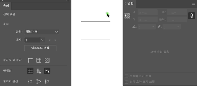 펜 도구로 만든 직선은 패스로 만들어지고 선분 도구로 만든 직선은 선이라는 모양 속성을 가진 패스로 만들어집니다. 따라서 제어 패널이나 속성 패널에서 패스를 선택해보면 어떤 방식으로 만들었는지 알 수 있습니다. 선분 도구로 만든 선은 도구 옵션에 있었던 것처럼 변형 패널에서 모양 속성을 수정할 수 있습니다. 펜 도구로 만든 선은 변형 패널에는 아무 옵션도 뜨지 않습니다.