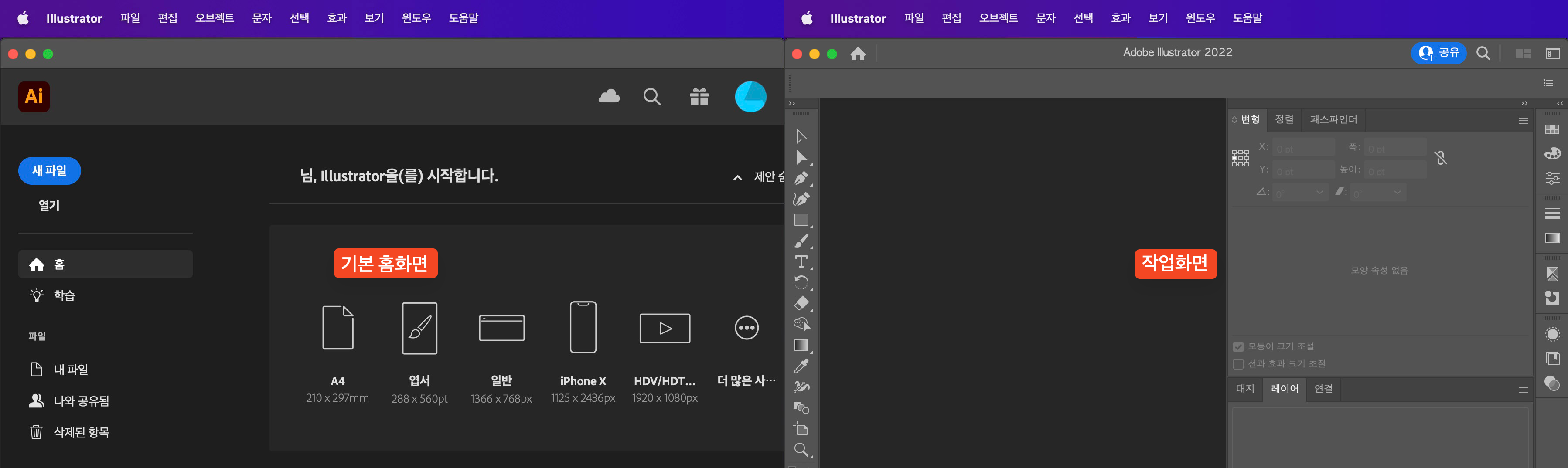 어도비 일러스트레이터 시작화면 ai아이콘 및 집모양 아이콘 _ mac