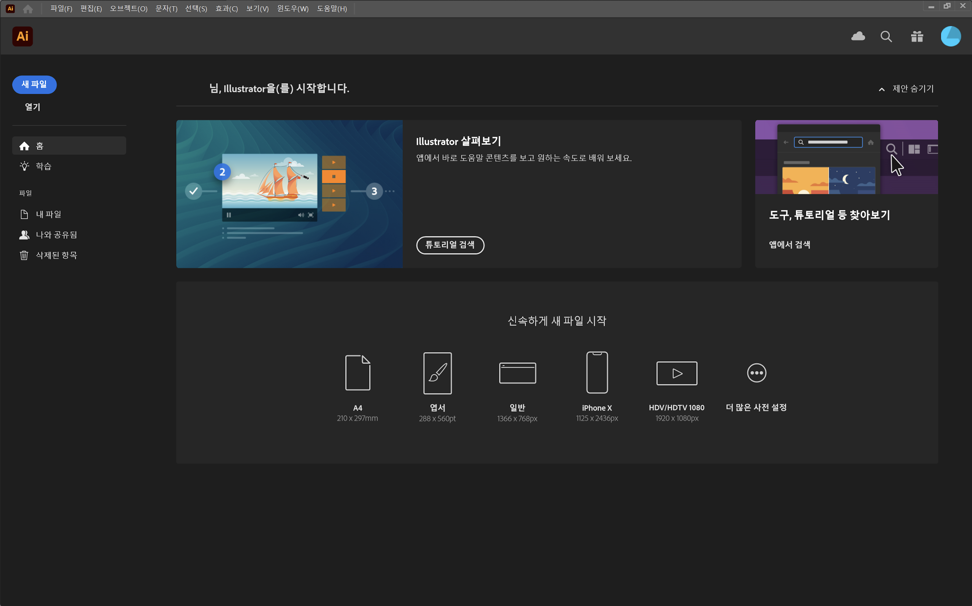 어도비 일러스트레이터 기본 홈 화면 및 작업화면