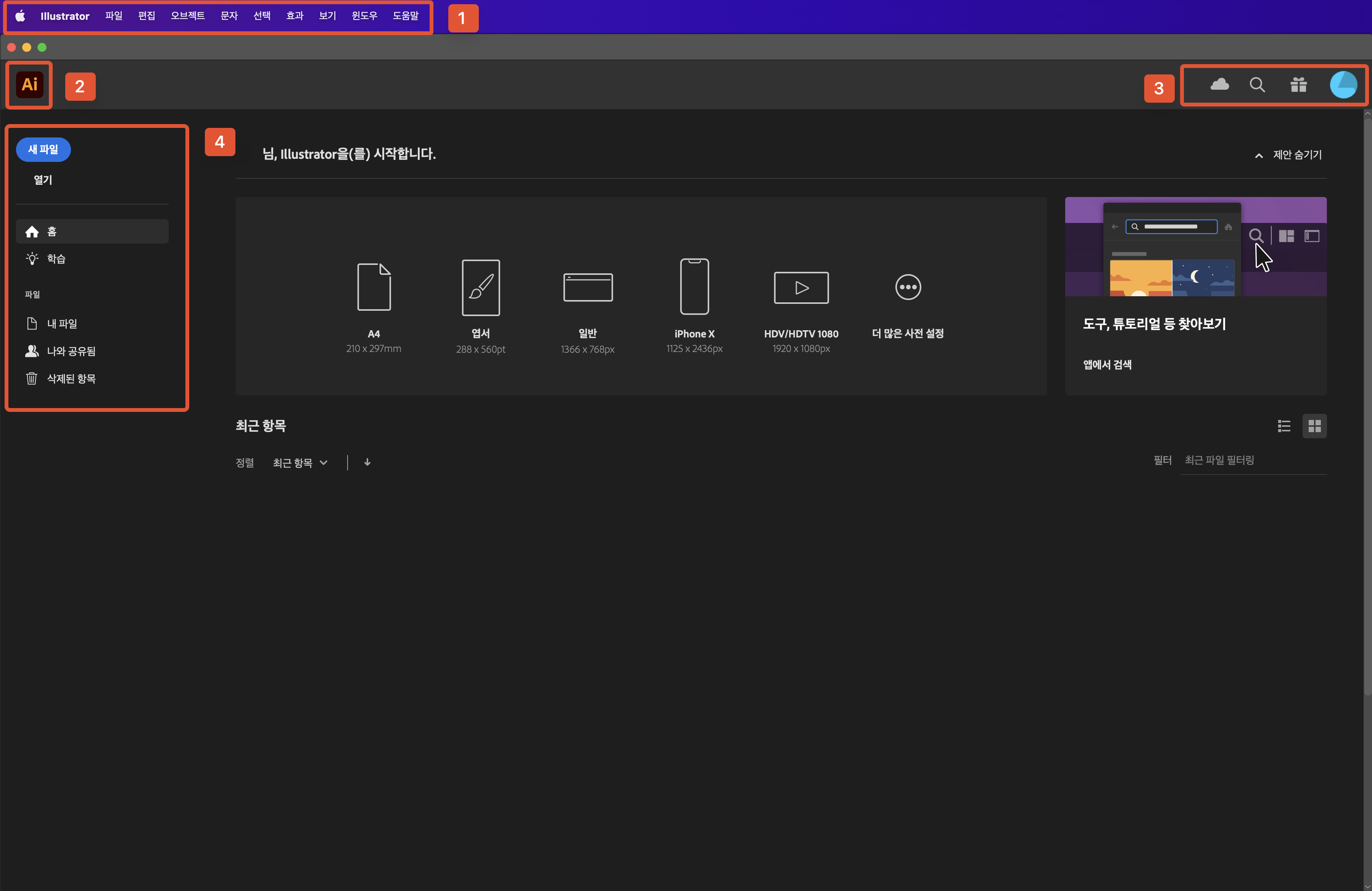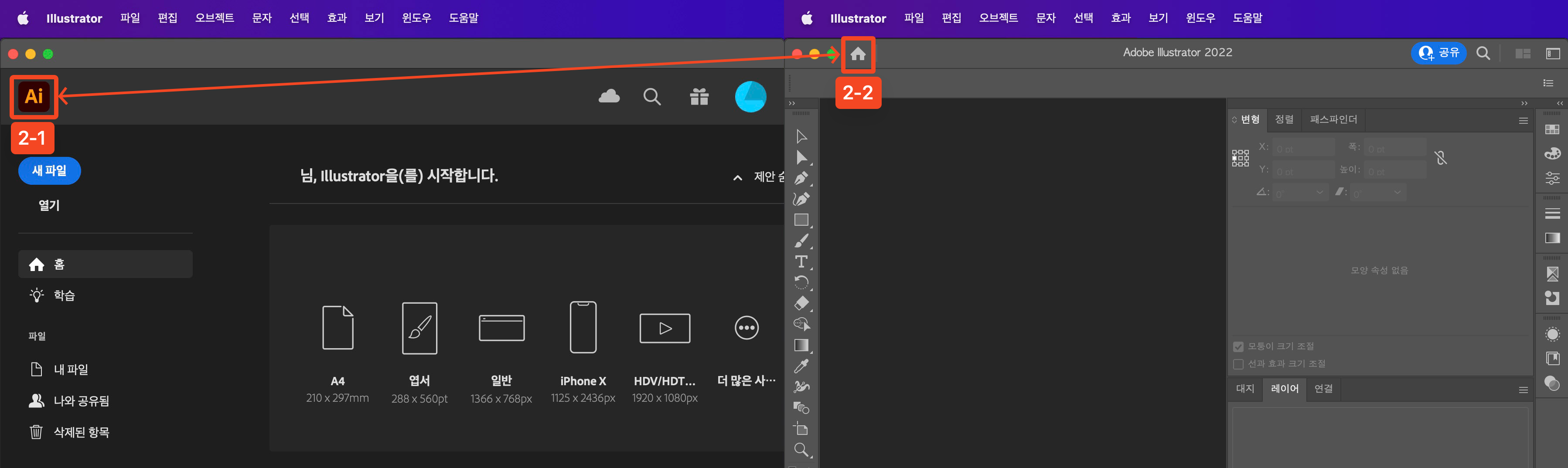 어도비 일러스트레이터 시작화면 ai아이콘 및 집모양 아이콘 _ mac