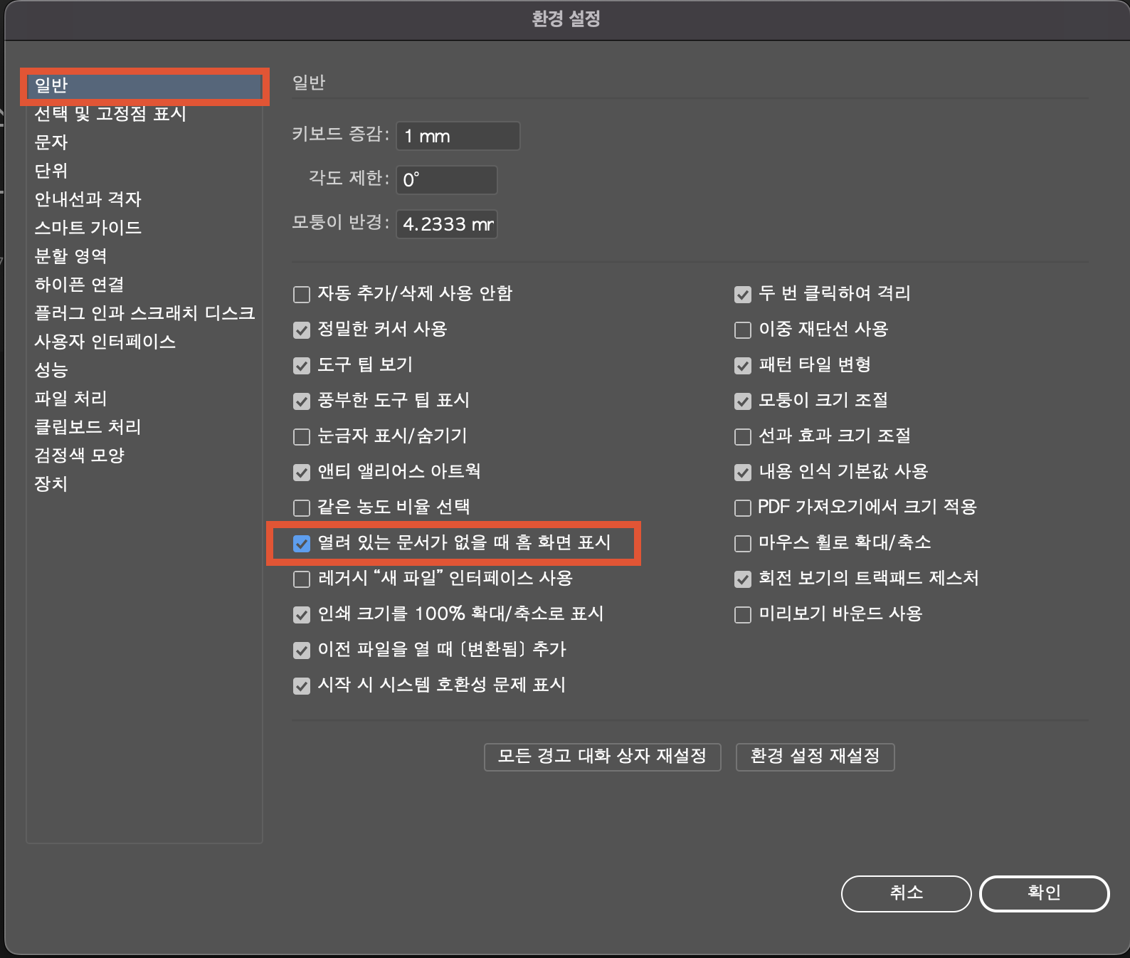 변경 방법은 간단합니다. 환경설정 > 일반으로 들어가서 열러 있는 문서가 없을 때 홈 화면 표시를 확인하면 됩니다. 체크된 상태가 기본 홈 화면이며, 체크박스나 해당 문장을 클릭하면 체크가 해제되고 환경 설정 창 하단에 확인 버튼까지 눌러주면 작업화면으로 적용이 됩니다. 적용 확인 방법은 일러스트레이터를 완전히 종료 후 다시 실행하면 원하는 화면으로 변경된 것을 확인할 수 있습니다.