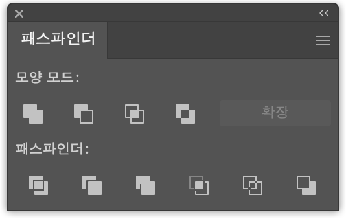 패스파인더 패널은 상단 메뉴 윈도우 > 패스파인더 또는 단축키 윈도우 ctrl + shift + F9 / 맥 ⌘(command) + ⇧(shift) + F9로 열고 닫을 수 있습니다. 패스파인더 패널에는 모양 모드와 패스파인더로 패스파인터 효과가 나눠져 있습니다. 모양 모드는 합치기, 앞면 오브젝트 제외, 교차영역, 교차영역 제외가 있고, 패스파인더는 나누기, 동색 오브젝트 분리, 병합, 자르기, 윤곽선, 이면 오브젝트 제외가 있습니다.