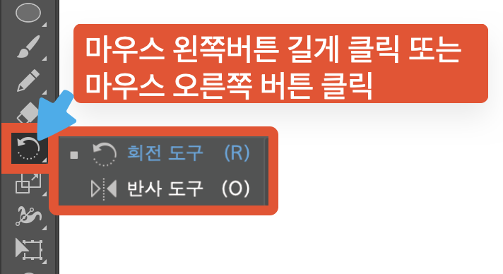 회전 도구와 반사 도구는 하나의 그룹으로 묶여있습니다. 회전 도구를 마우스 왼쪽 버튼을 길게 클릭하거나 마우스 오른쪽 버튼을 클릭하여 반사 도구를 선택할 수 있습니다.