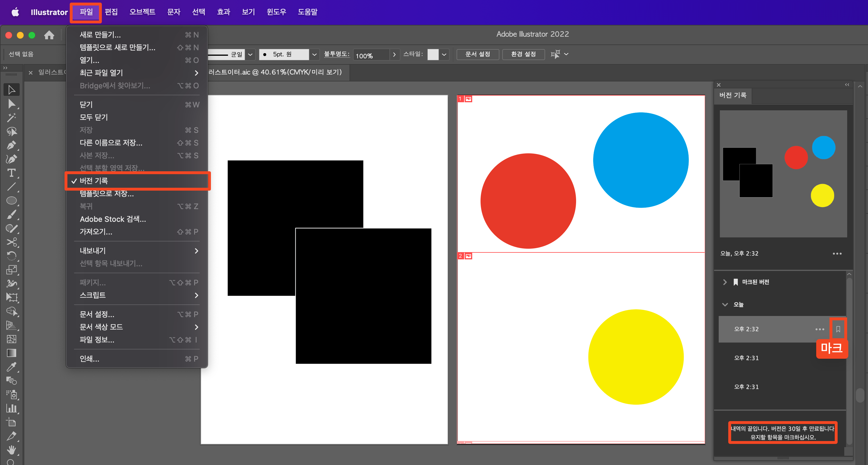 버전 기록은 클라우드에 문서를 저장할 때 사용할 수 있는 것으로 자신의 컴퓨터에 저장했다면 버전 기록 패널에는 아무것도 보이지 않습니다. 클라우드로 저장하면 날짜와 시간으로 기록이 남게되고 그 기록은 30일 후 지워집니다. 지워지게 하고 싶지 않다면 마크를 하면됩니다. 디자인을 하다보면 위치를 조금씩 변경하거나 새로운 시안으로 변경될 때가 많은데 그때마다 다른 이름으로 저장이나 사본 저장으로 파일을 많이 생성합니다. 클라우드에 저장한다면 하나의 파일로 여러가지 시안을 저장할 수 있어 파일 관리에 용이합니다. 또한 클라우드로 저장을 하게 되면 파일을 공유할 수 있기 때문에 팀으로 같이 작업할 때 빠른 작업이 가능합니다.