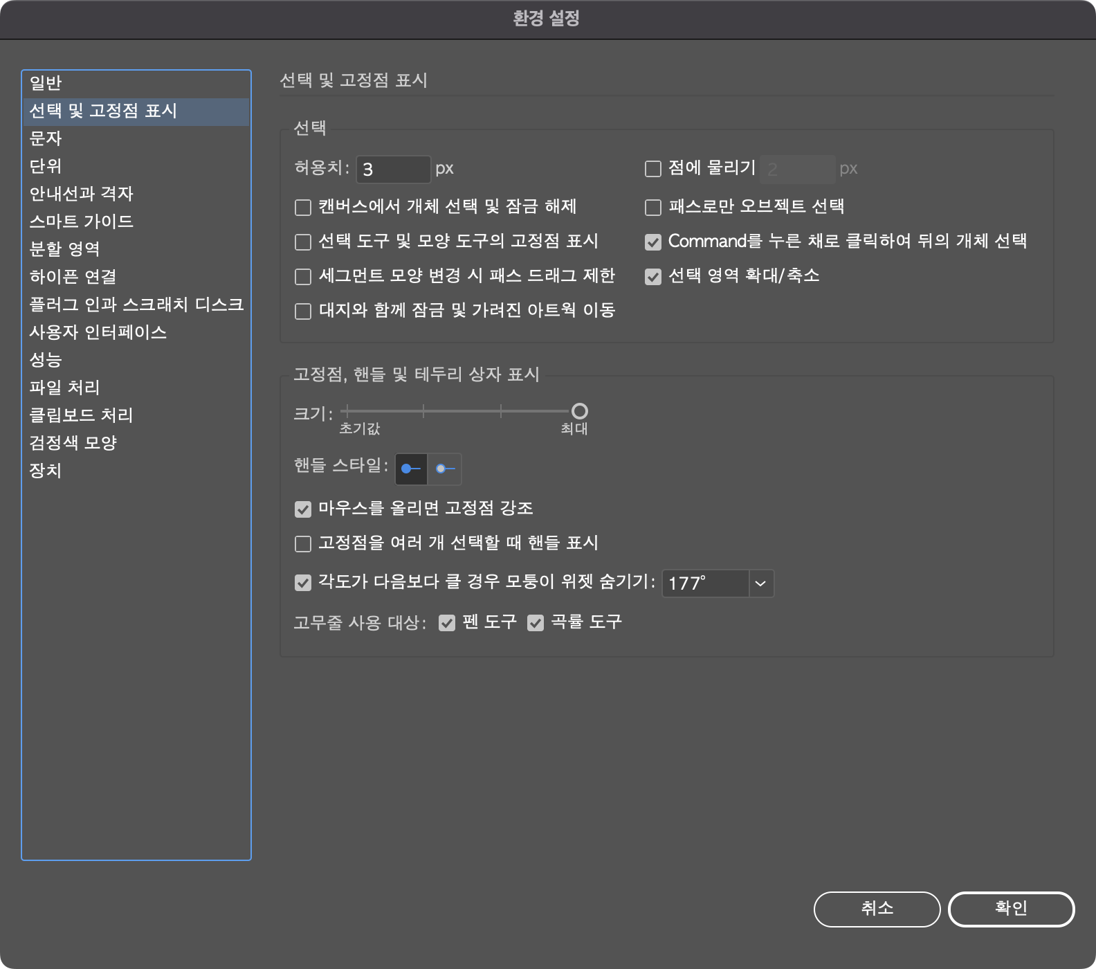 ▢ 선택 도구 및 모양 도구의 고정점 표시