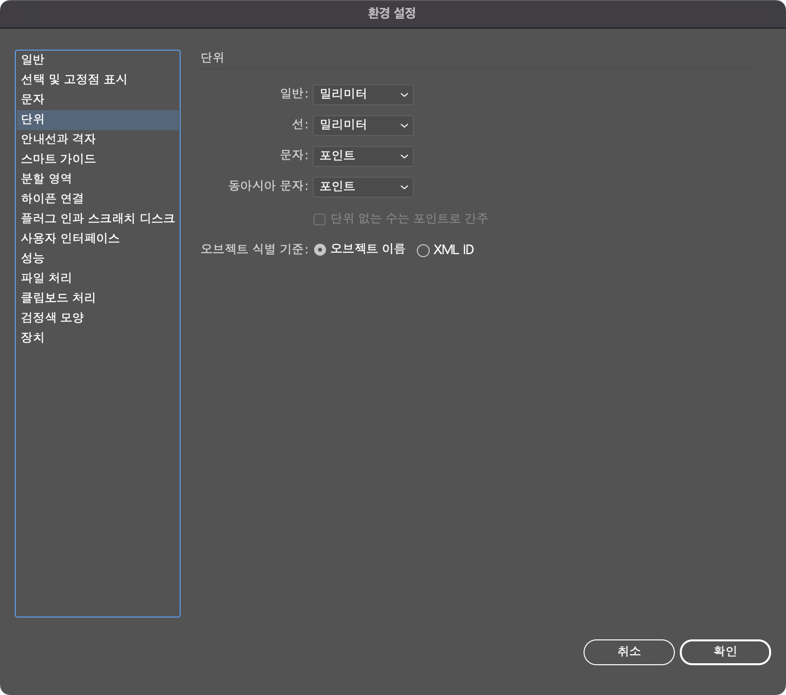 문자 : 문자는 포인트, 인치, 밀리미터, Q, 픽셀로 설정할 수 있습니다. 문자크기, 행간의 단위를 나타냅니다.