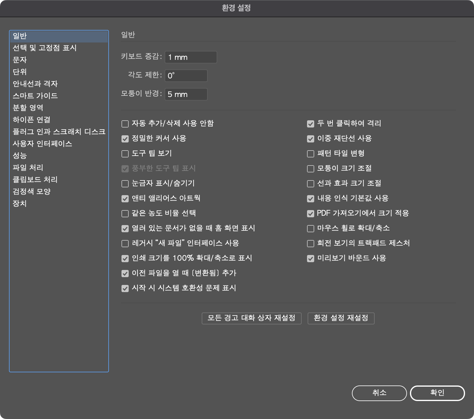 일러스트레이터를 사용할 때 작업환경 변경할 때 사용합니다. 키보드 방향키를 한번 누를 때 움직이는 값을 변경하거나 선택한 패스, 문자, 단위 등 사용자에 편리하게 수정할 수 있습니다.  ✅로 표시하는 부분은 권장, 사용 중 자주 변경하는 것은 🔹로 표시해두겠습니다. 사용자의 환경에 맞게 설정해주시면 됩니다.