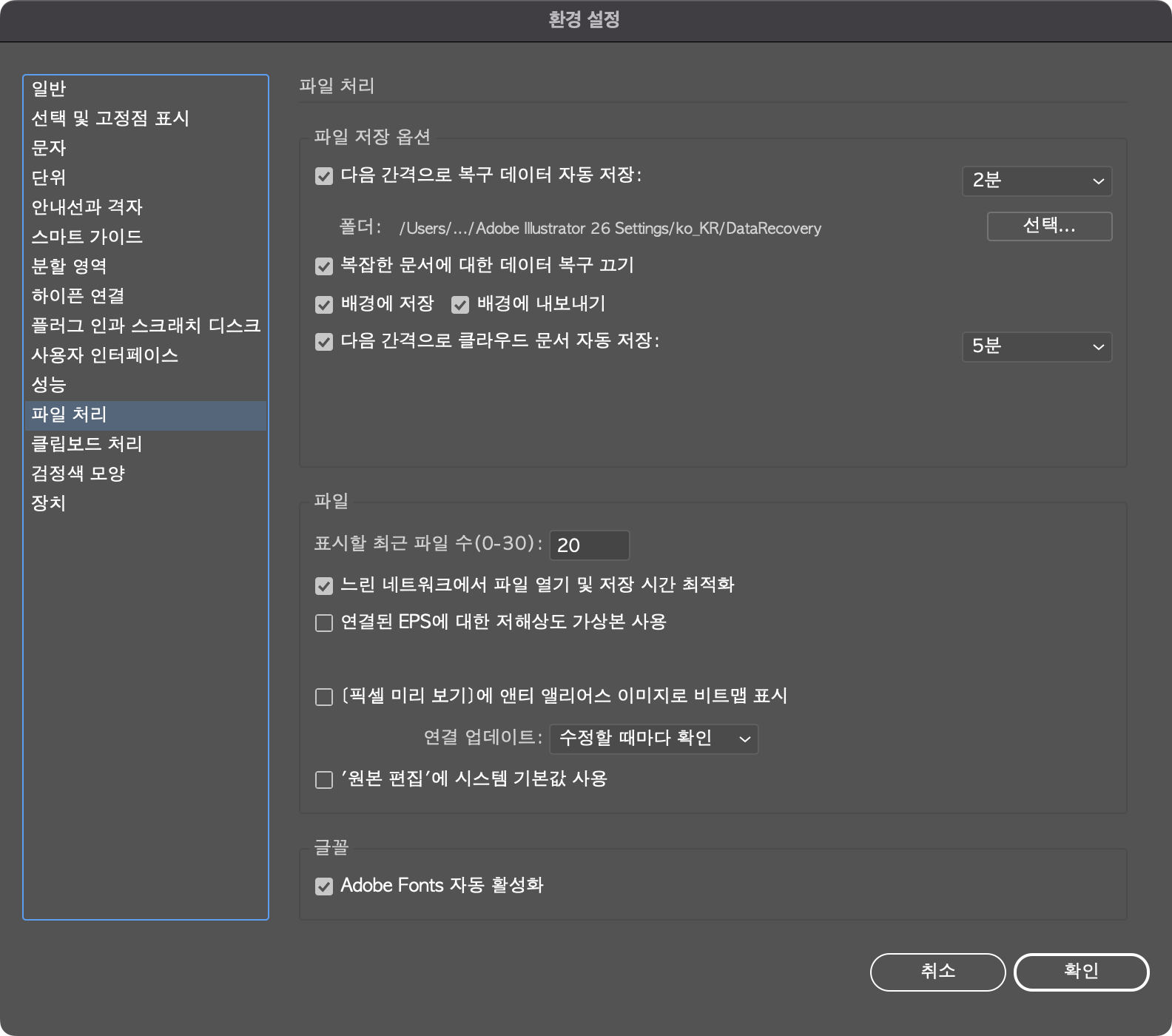 파일 처리는 일러스트레이터를 사용하는 도중 문제가 생겨 사용할 수 없는 상태가 되어 강제 종료하거나 종료될 때 복구할 데이터를 저장할 수 있고 홈 화면에 나타나는 최근 작업 파일의 개수를 정할 수도 있습니다.