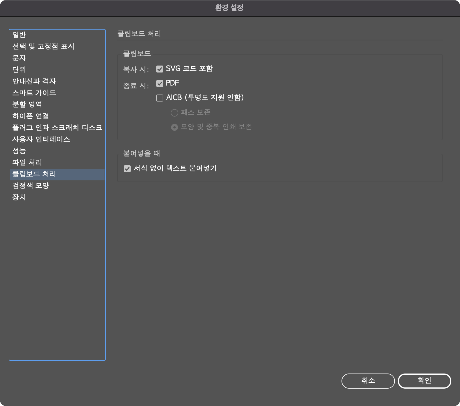 환경설정창은 윈도우(window) 상단 메뉴 편집 > 환경설정 > 일반 / 맥(mac) 상단 메뉴 illustrator > 환경설정 > 파일 처리 또는 클립보드 처리를 선택하거나 단축키 윈도우 ctrl+K / 맥 ⌘(command)+K를 눌러서 환경설정 창의 일반을 열어 파일 처리 또는 클립보드 처리를 눌러줍니다.