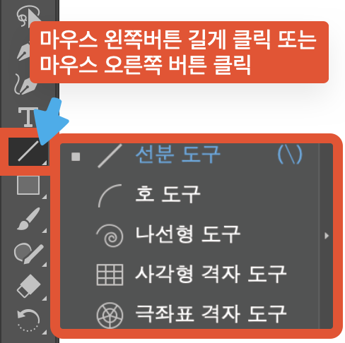사각형 격자 도구 및 극좌표 격자 도구는 도구 모음에서 선분 도구와 함께 그룹 되어있어, 마우스 왼쪽 버튼으로 길게 클릭하거나, 마우스 오른쪽 버튼으로 클릭하여 나머지 도구들을 클릭할 수 있습니다.