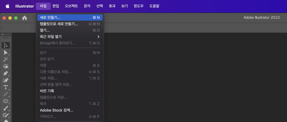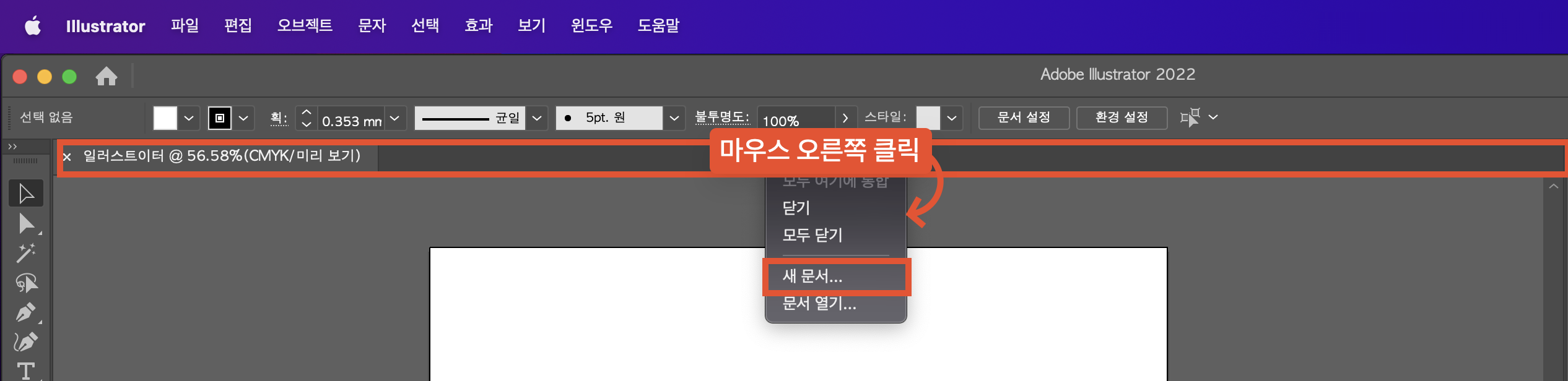 파일이 열여있을 때 상단 메뉴 파일 > 새로 만들기 또는 단축키 window( ctrl + N ) / mac ( cmd + N ) 외에 다른 방법이 있습니다. 파일 탭 줄에 마우스 오른쪽 클릭을 하면 작은 선택 상자가 나오는데 그중 새 문서를 선택하면 '새로운 문서 만들기'창이 열립니다.