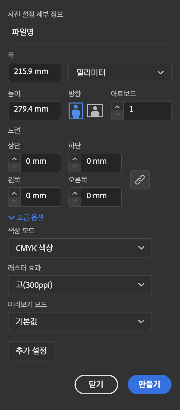새로운 문서 만들기 또는 추가 설정으로 목적에 맞게 설정 후 만들기 또는 문서 만들기를 눌러 파일을 생성해줍니다. 아트보드(대지) 크기를 잘못 만들었다 하더라도 괜찮습니다. 만들고 난 후에도, 작업 중인 파일도 모든 설정이 변경이 가능합니다.