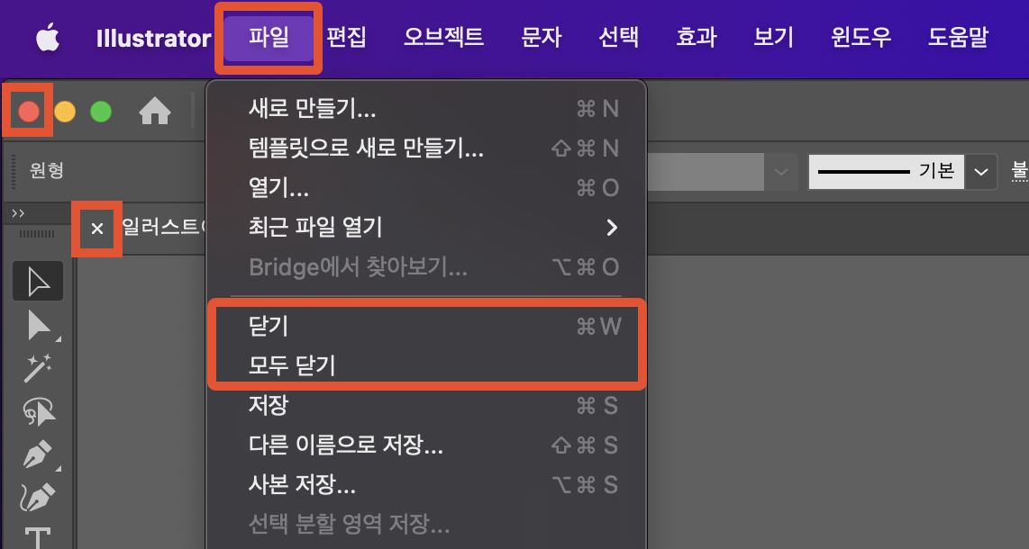 맥(mac)   | 상단 메뉴   illustrator > illustrator종료( ⌘(command) + Q