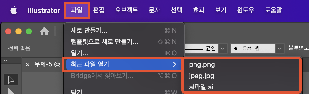 일러스트레이터에서 기존에 작정된 파일을 여는 방법은 여러 가지가 있습니다. 아래의 방법 중 편한 방법으로 기존 파일을 열 수 있습니다.
