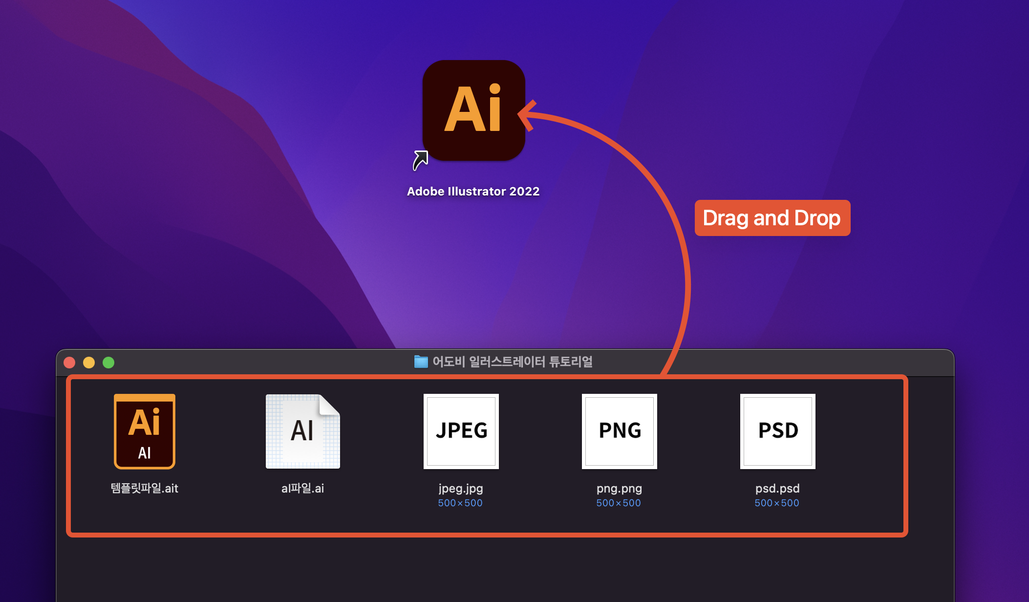 2. 일러스트에서 열 수 있는 모든 파일 : 열고싶은 파일을 1개 이상 선택하여 일러스트레이터 바로가기 아이콘에 드래그 앤 드롭하면 그 파일들이 모두 열립니다. 아래에 일러스트레이터에서 열 수 있는 확장자를 확인해주세요.