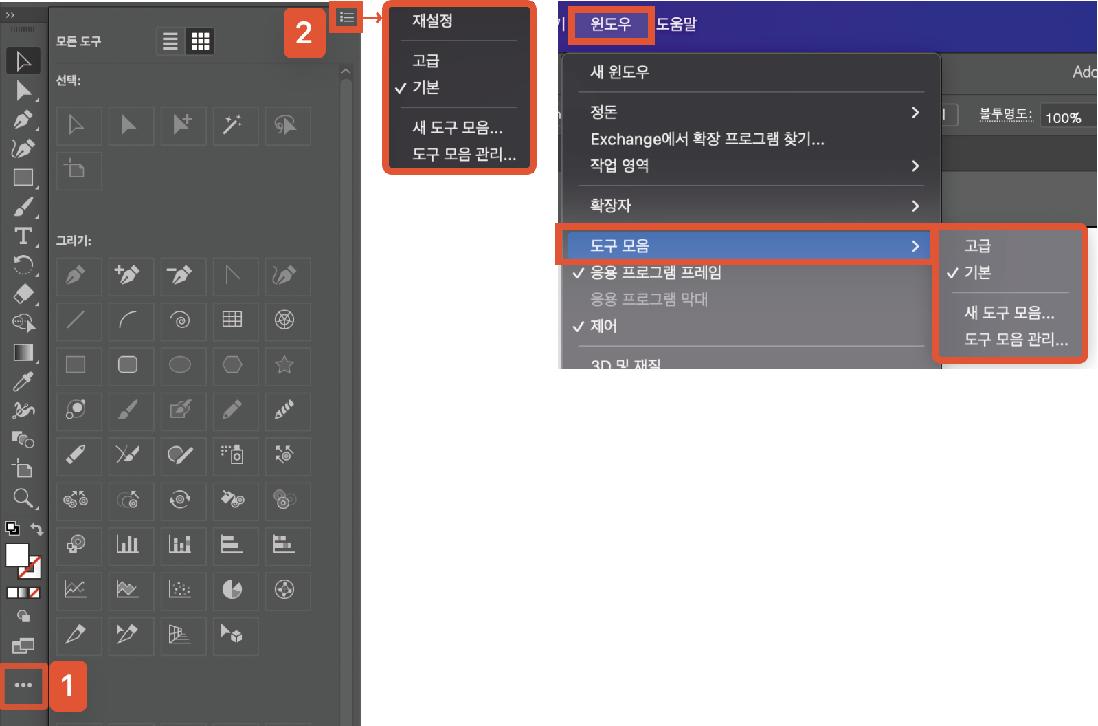 어도비 일러스트레이터 도구모음 기본, 고급 변경하기