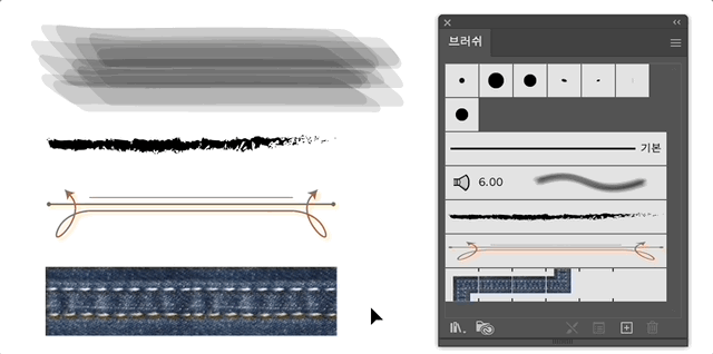 브러쉬는 선과 비슷한 붓글씨 브러쉬와 뿌려지는 효과가 있는 산포 브러쉬, 붓 모양의 강모 브러쉬, 모양이 있는 아트 브러쉬, 일정한 패턴을가진 패턴 브러쉬가 있습니다. 오른쪽 상단 아이콘을 눌러서 원하는 브러쉬만 체크하여 볼 수 있고 축소판 보기 또는 목록 보기로 변경할 수 있습니다.
