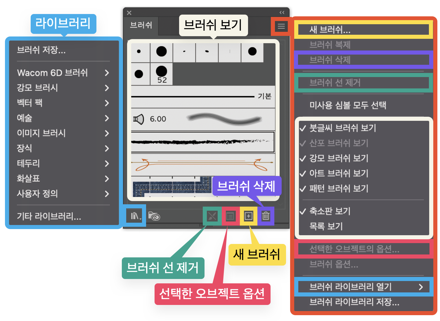 브러쉬 라이브러리는 브러쉬 패널 하단 맨 왼쪽에 위치하고 있으며 아이콘을 클릭하면 여러 모양의 브러시가 저장되어있습니다. 라이브러리에서 하나를 선택하면 선택한 라이브러라의 패널이 나오고 그 패널 아래 ◀ ▶ 를 눌러 저장되어있는 라이브러리를 순서대로 볼 수 있습니다. 브러시 라이브러리 패널을 고정하고 싶다면 오른쪽 상단 아이콘을 눌러 지속을 눌러주면 일러스트 실행시 항상 라이브러리를 볼 수 있습니다. 나만의 브러쉬를 만들어서 라이브러리에 저장할 수 있고, 하단 기타 라이브러리를 누르거나 상단메뉴 윈도우 > 브러시 라이브러리 > 기타라이브러리를 눌러 외부파일을 불러올 수 있습니다.